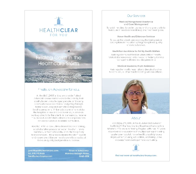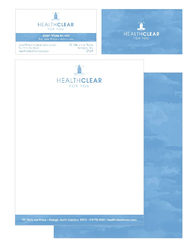 Joan Moss, a registered nurse with a kind and compassionate heart, came to me wanting to brand her new patient advocacy business. After seeing her father through sickness and acting as his Advocate, she knew she wanted to use her experience in the healthcare world for this purpose. We wanted the look to be clear and calming for people navigating her materials and website, as the healthcare system in general is confusing and frustrating. We used a watercolor-inspired lighthouse as the main image, as it represents a light in the dark, and she also loved the lighthouses and blue water of her home in Michigan.